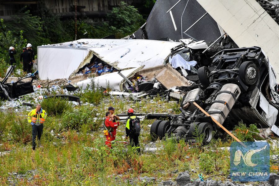 Photo taken on Aug. 14, 2018 shows a partially collapsed bridge in Genoa, Italy. Built in the 1960s, the Morandi Bridge is a major connection for the port city of Genoa. (Xinhua/Alberto Lingria)