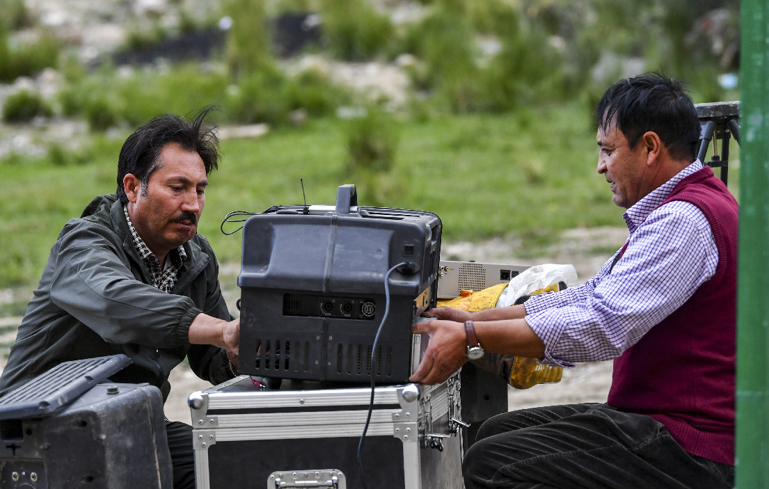 Photo taken on June 29, 2019 shows two projectionists are setting up projection machine in a village in Tajik Autonomous County of Taxkorgan in Xinjiang, northwest China. (Xinhua)