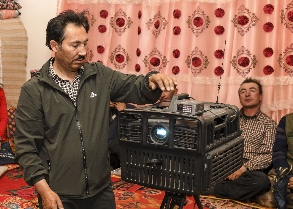A projectionist is operating his projection machine at the house of a local villager in Tajik Autonomous County of Taxkorgan in Xinjiang, northwest China, on June 29, 2019. (Xinhua)