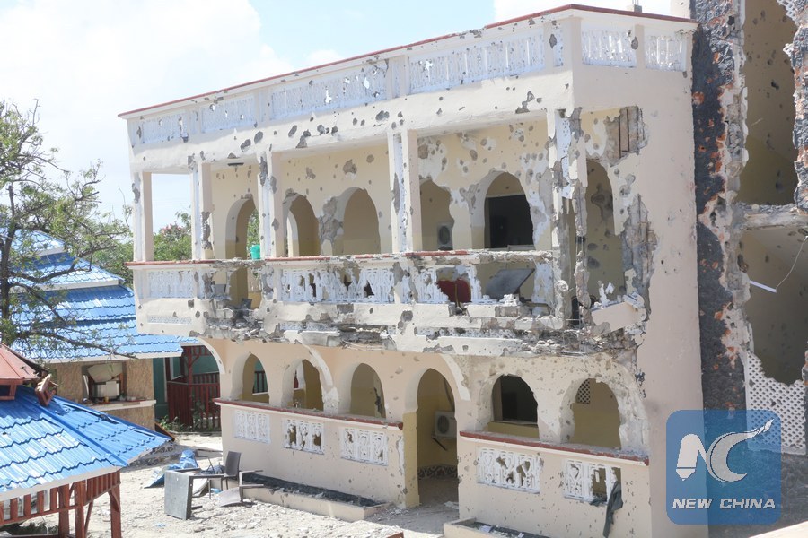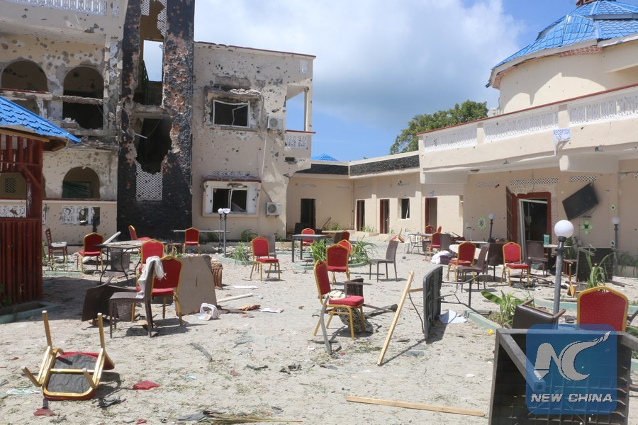 Destructed materials scatter Medina hotel in the southern port town of Kismayo after Al-Shabab militants attacked the hotel, killing more than 26 and wounding 56 others. (Xinhua)