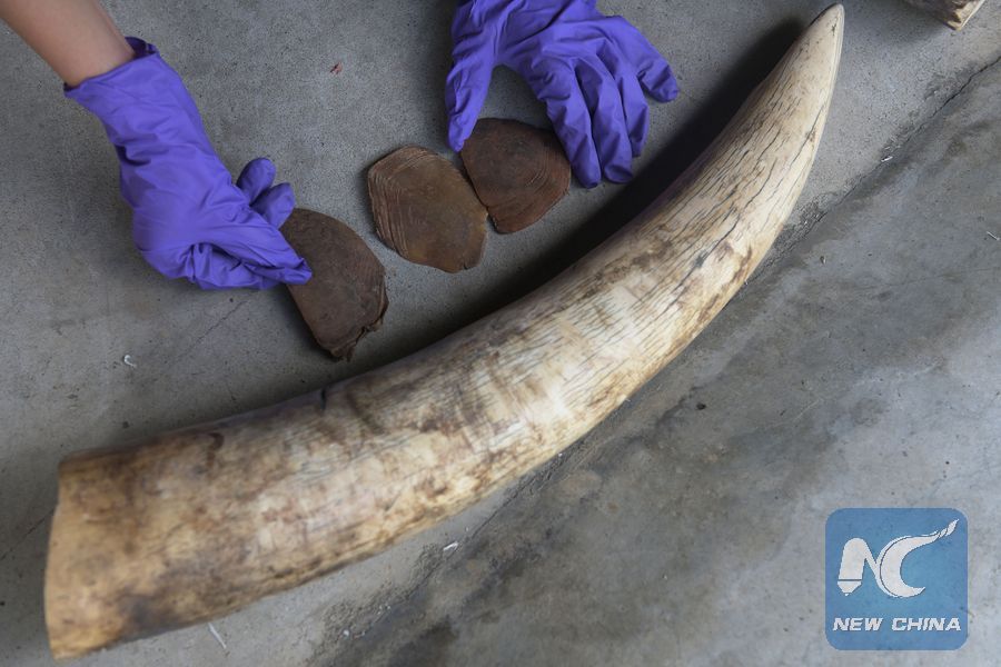 Photo shows the seized pangolin scales and elephant ivory in Singapore on July 23, 2019. (Xinhua/Then Chih Wey)