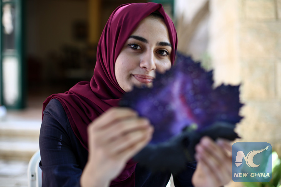 A portrait of Palestinian young woman Leen Alhaj, display a grape leaf drawn with beautiful paintings, inside her house in Nuseirat refugees camp in the central Gaza Strip, July 22, 2019. (Xinhua/Stringer)