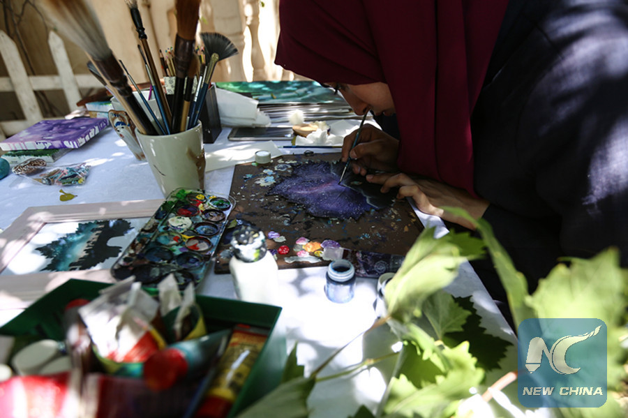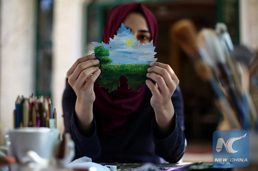GAZA, July 25 (Xinhua) -- Leen Alhaj, 21, based in Nuseirat refugees camp in the central Gaza Strip, is drawing on grape leaves and turning them into beautiful paintings.