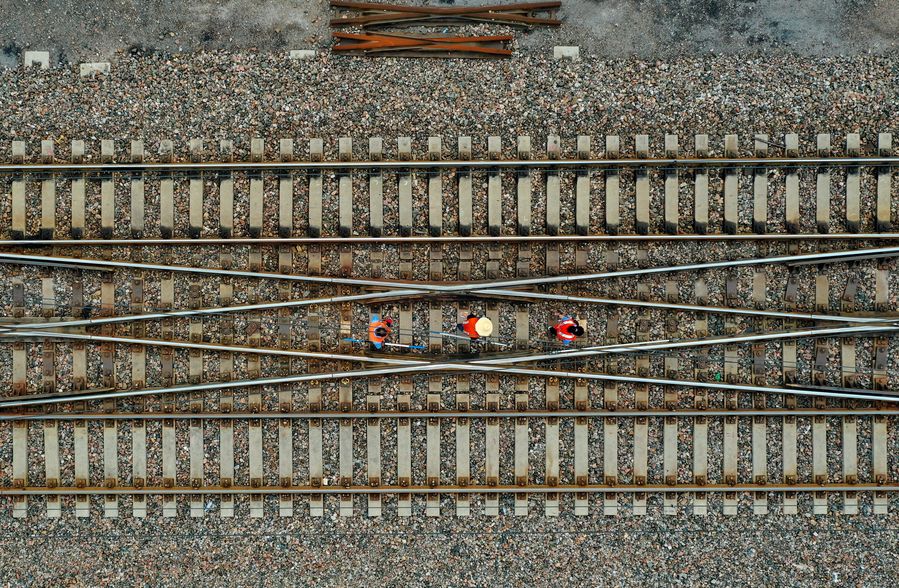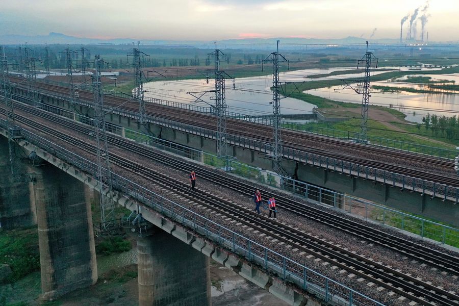 China Railway Taiyuan Group Co., Ltd. inspectors patrol on the Datong section of the Daqin Railway in Datong, north China's Shanxi Province. (Xinhua/Cao Yang)