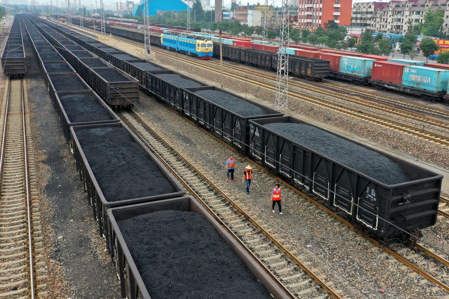 A train carrying coal runs on the Daqin Railway in Datong, north China's Shanxi Province. (Xinhua/Cao Yang)