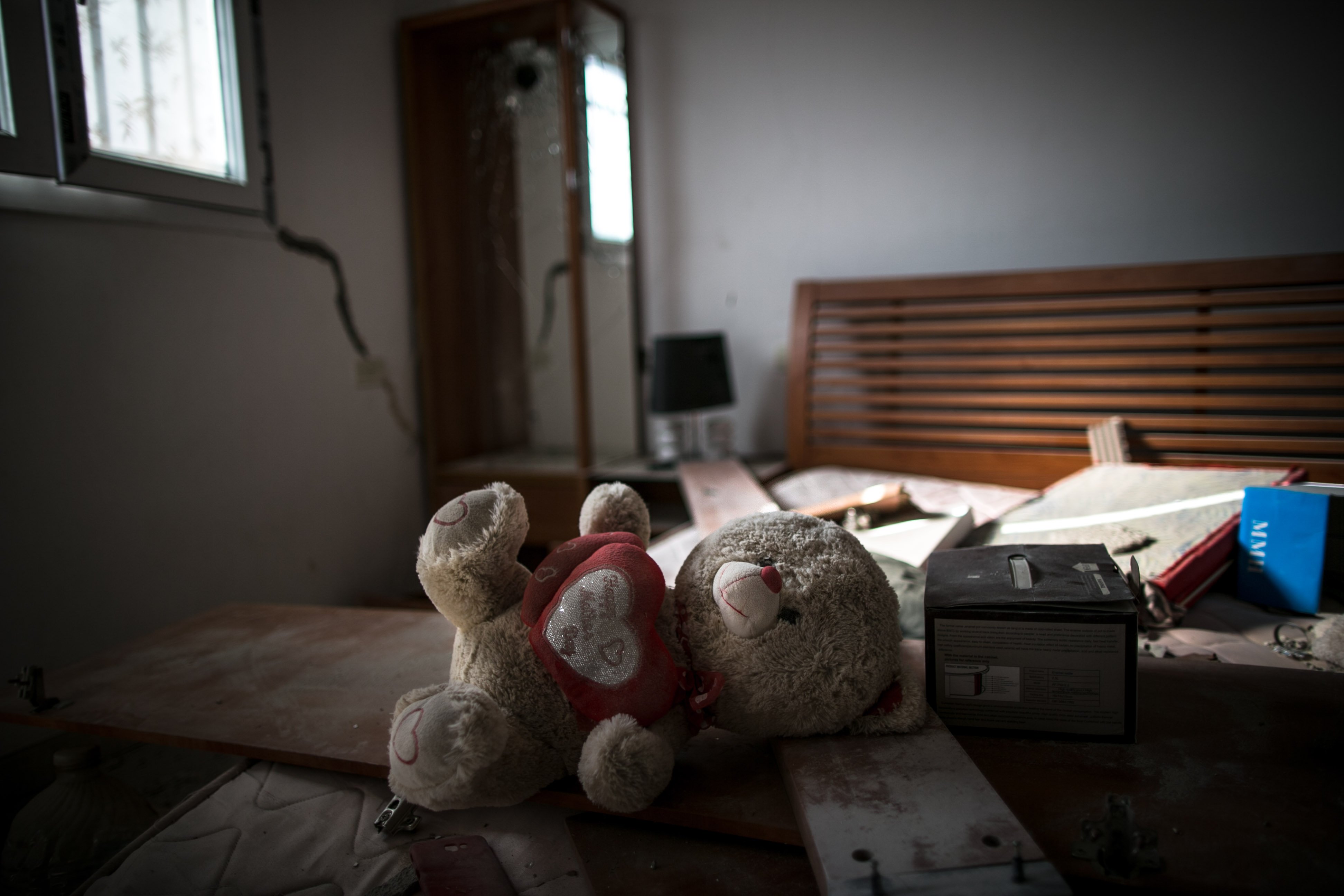 A stuffed bear is seen in an abandoned house during clashes between the UN-backed Libyan government and the east-based army in Salahuddin, Tripoli, Libya, on May 2, 2019. (Xinhua/Amru Salahuddien)