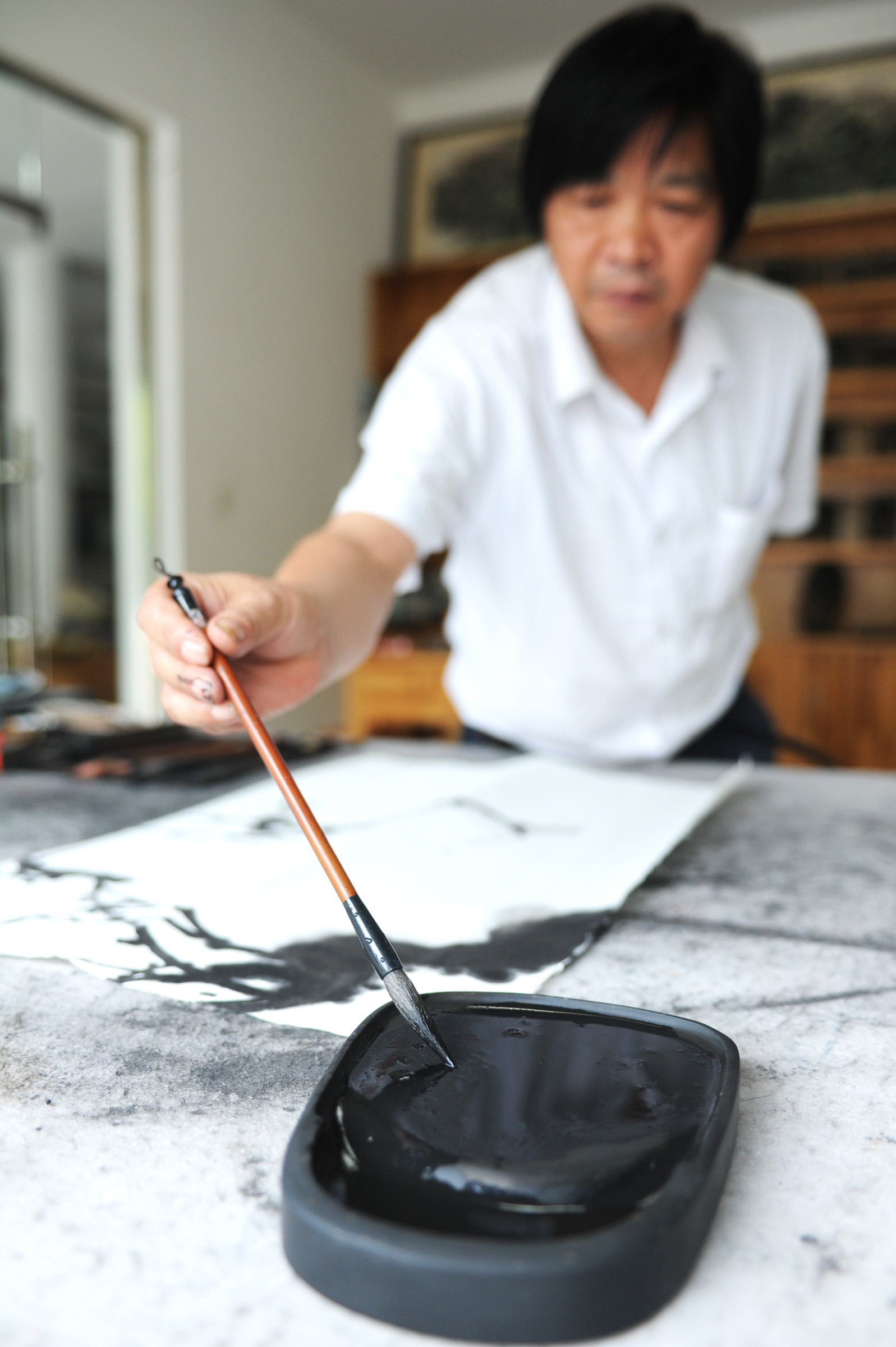 A painter draws with an inkstone in Shexian County of east China's Anhui Province.(Xinhua/Du Yu)