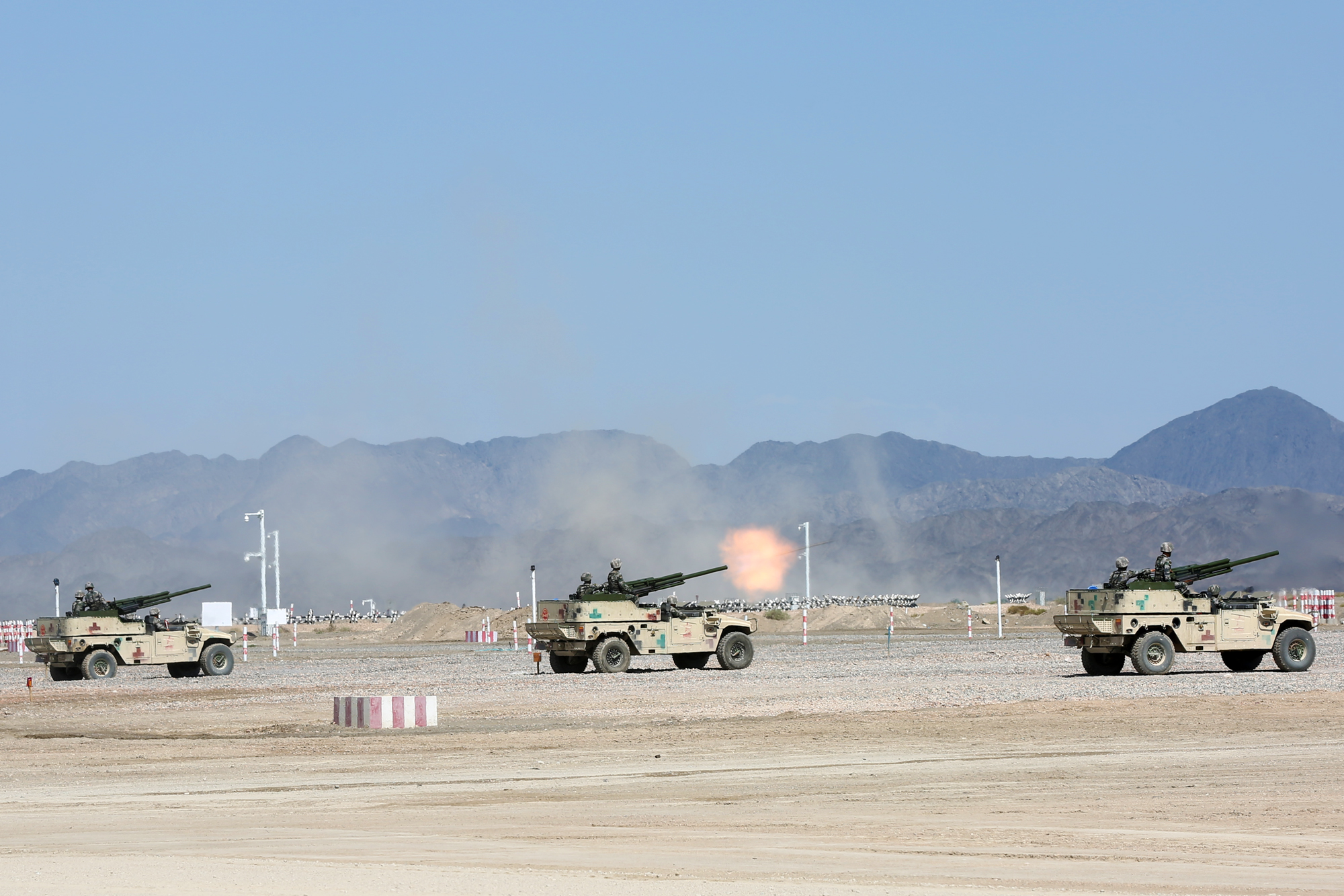 Vehicle-mounted mortars fire in a military presentation in Korla, northwest China's Xinjiang Uygur Autonomous Region, Aug. 3, 2019. (Photo by Zhao Zhiguo/Xinhua)