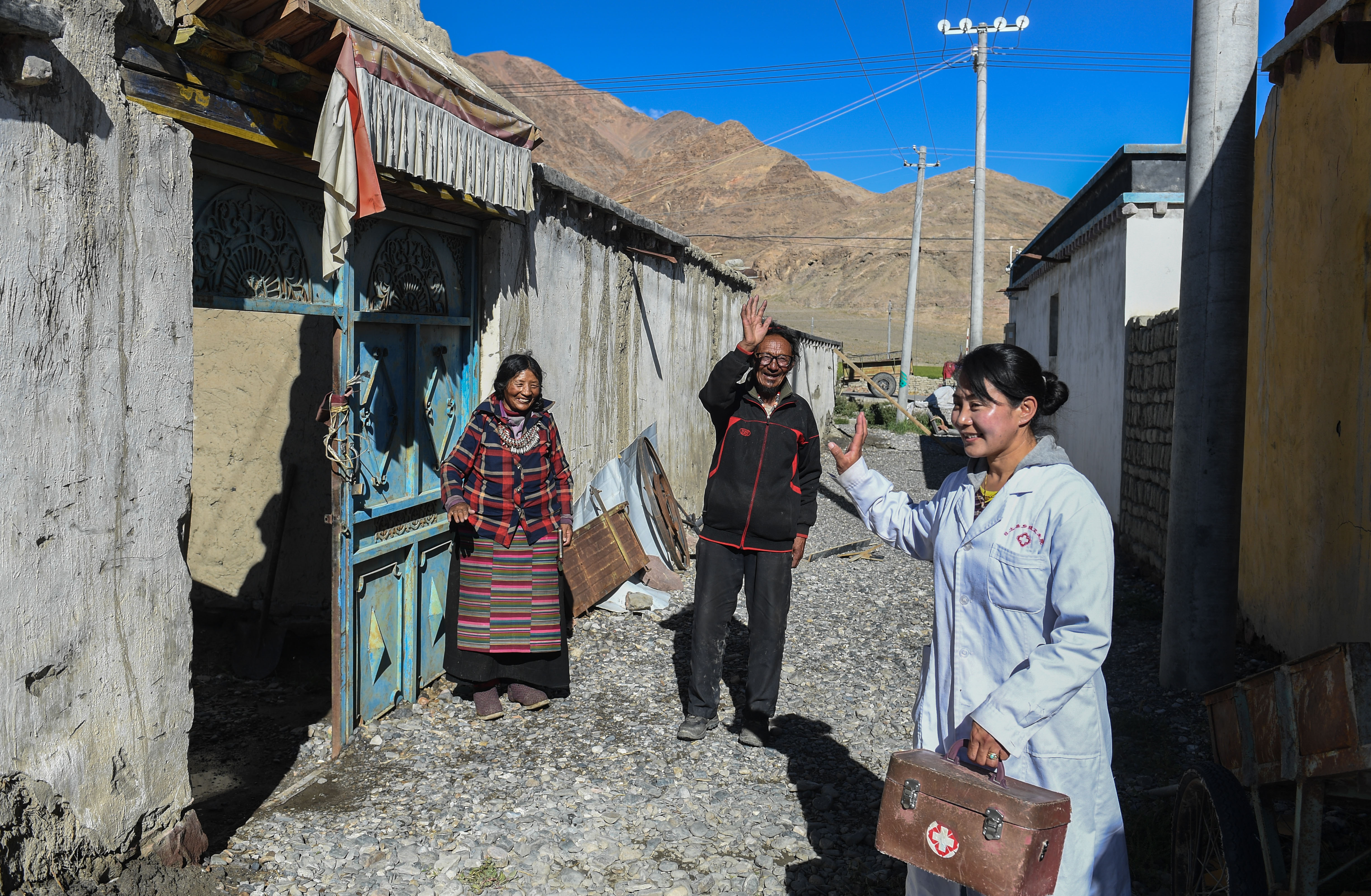 Zhoima (L) makes a home visit to a patient in Wuqang Village, SW China's Tibet Autonomous Region, Aug. 3, 2019. (Xinhua/Jigme Dorje)