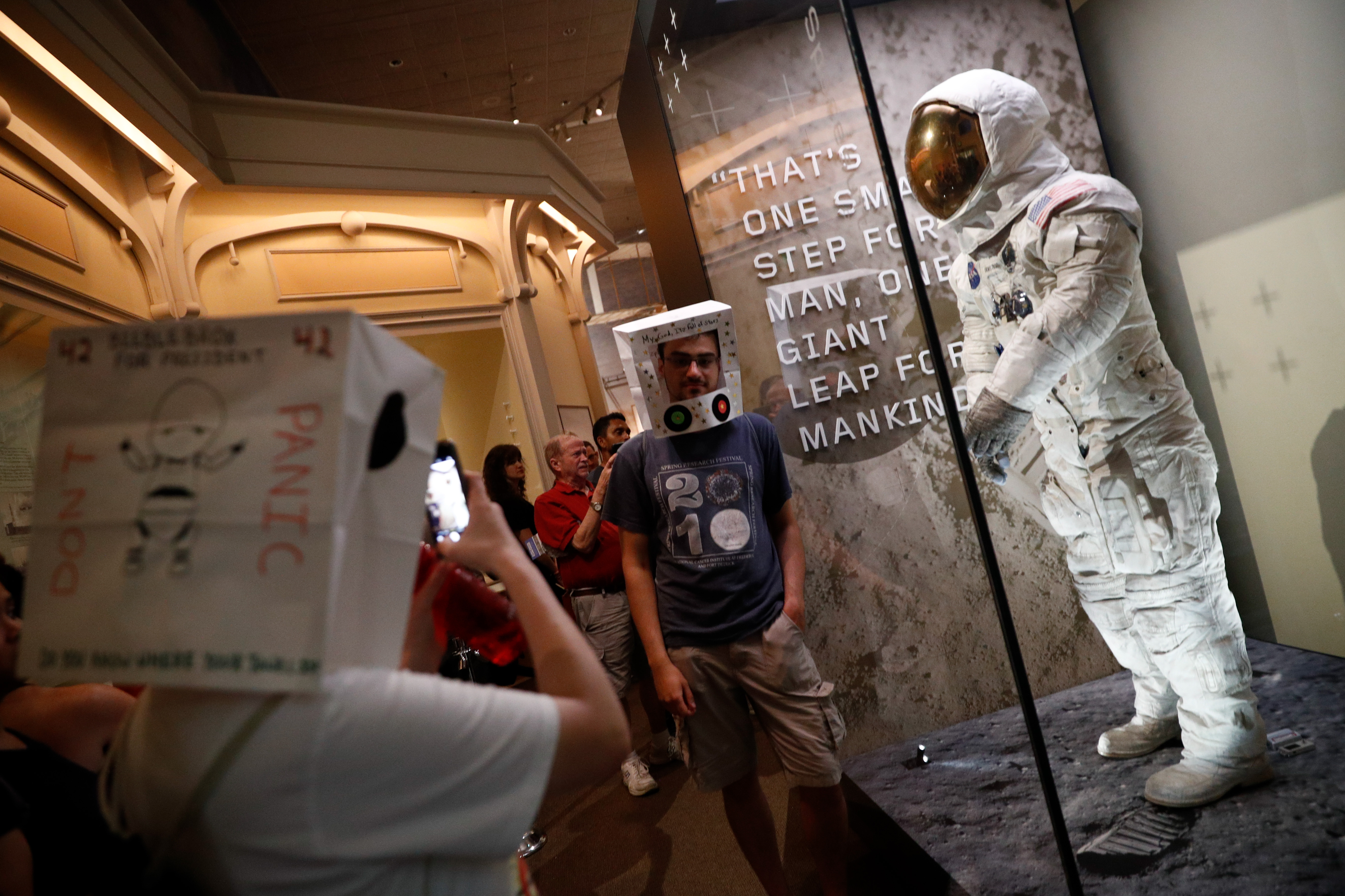 A visitor poses for photos with the spacesuit worn by astronaut Neil Armstrong during a late-night celebration commemorating the 50th anniversary of the Apollo 11 moon landing at the Smithsonian National Air and Space Museum, in Washington D.C., the United States, on July 21, 2019. (Xinhua/Ting Shen)