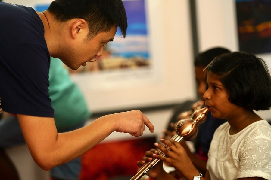 A student in Colombo, Sri Lanka is learning playing Hulusi, a free-reed wind instrument from China, Aug. 9, 2019. (Xinhua/Tang Lu)