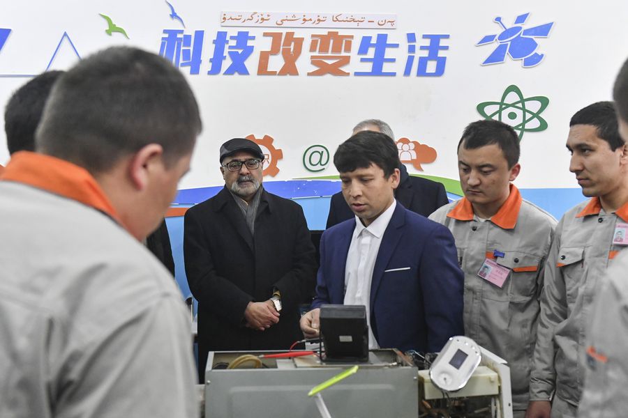Farukh Akhter Amil (wearing hat), permanent representative of Pakistan to the UN Office at Geneva, visits an electronics training class at the vocational education and training center in Moyu county of Hotan Prefecture, northwest China's Xinjiang Uygur Autonomous Region, Feb. 18, 2019.(Xinhua/Ma Kai)