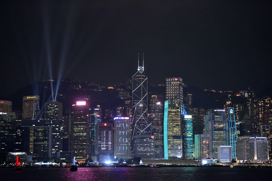 Photo taken on Dec. 1, 2017 shows nightly light show in Victoria Harbour, south China's HongKong, Dec. 1, 2017. (Xinhua/Wang Xi)