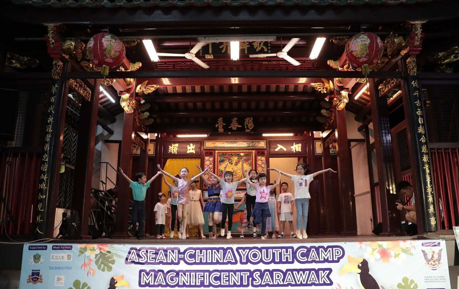 Malaysian and Chinese children perform dancing during the talent night of the ASEAN-China Youth Camp: Magnificent Sarawak, held in Kuching in east Malaysia's Sarawak, July 18, 2018. (Xinhua/Zhu Wei)