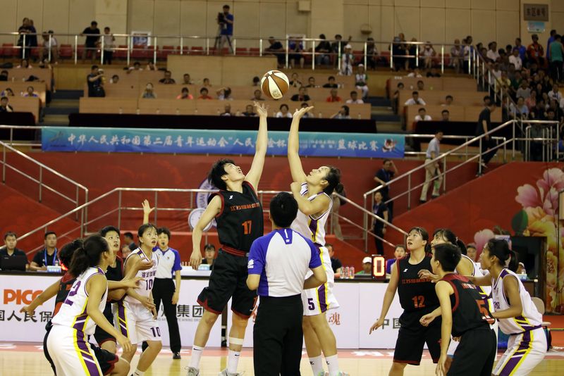 Luo Xinyu (Top L) of Jiangsu Xianlin tips off the final of the U-18 women's basketball sports schools tournament against Beijing Haidian at the 2nd China Youth Games in Taiyuan, north China's Shanxi Province on August 17, 2019. (Photo courtesy of Taiyuan University of Technology)