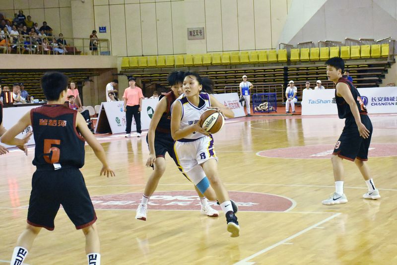 Li Meitong (2nd R) of Beijing Haidan competes during the final of the U-18 women's basketball sports schools tournament against Jiangsu Xianlin at the 2nd China Youth Games in Taiyuan, north China's Shanxi Province on August 17, 2019. (Photo courtesy of Taiyuan University of Technology)