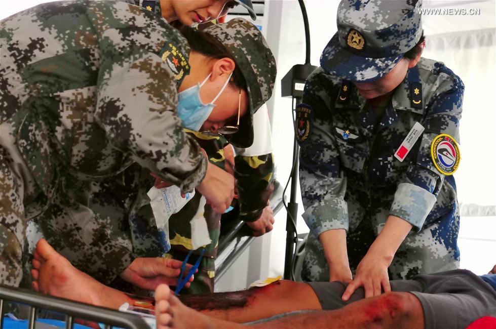 Participants take part in the drills during the "Peace Train-2019" China-Laos humanitarian and medical joint rescue exercise in Vientiane, capital of Laos, Aug. 18, 2019. (Xinhua/Zhang Jianhua)