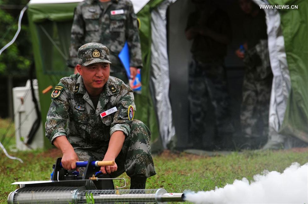 Participants take part in the comprehensive epidemic prevention and control drills during the "Peace Train-2019" China-Laos humanitarian and medical joint rescue exercise in Vientiane, capital of Laos, Aug. 18, 2019. (Xinhua/Zhang Jianhua)