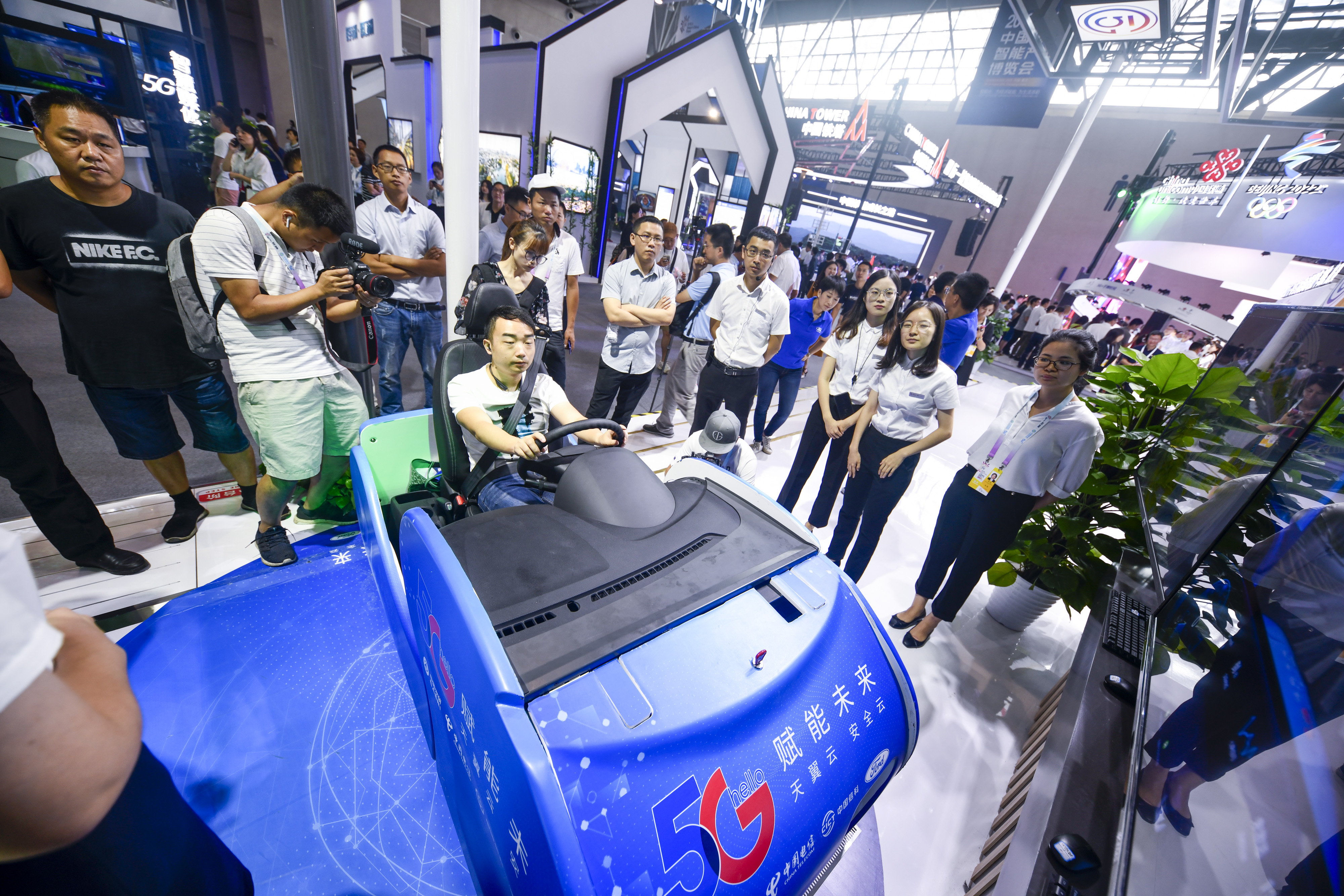 A staff member shows a 5G-based remote driving technology during the 2019 Smart China Expo in southwest China's Chongqing Municipality, Aug. 26, 2019. (Xinhua/Tang Yi)