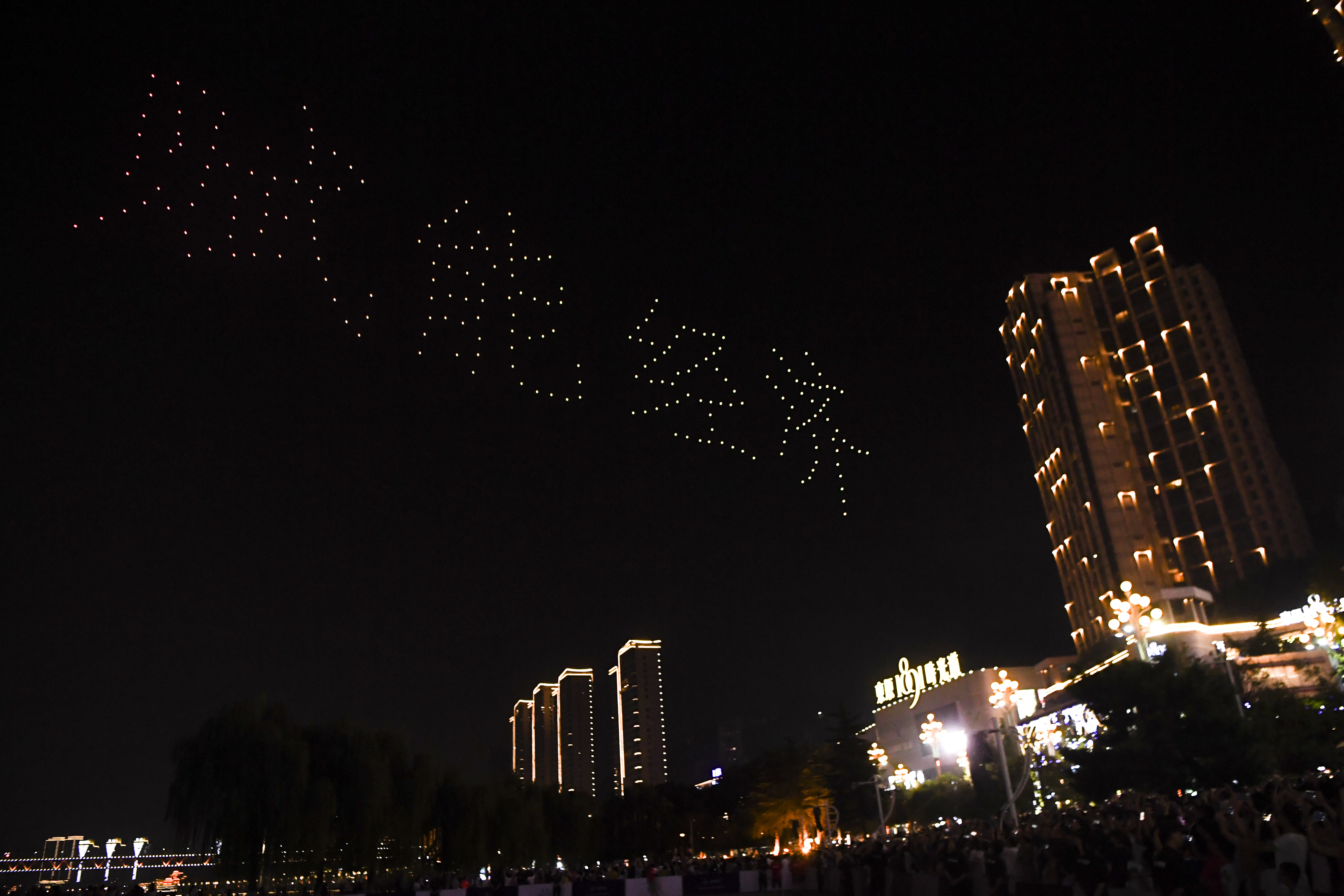 Drones make up the logo of the 2019 Smart China Expo during a drone light display in southwest China's Chongqing, Aug. 26, 2019. (Xinhua/Wang Quanchao)