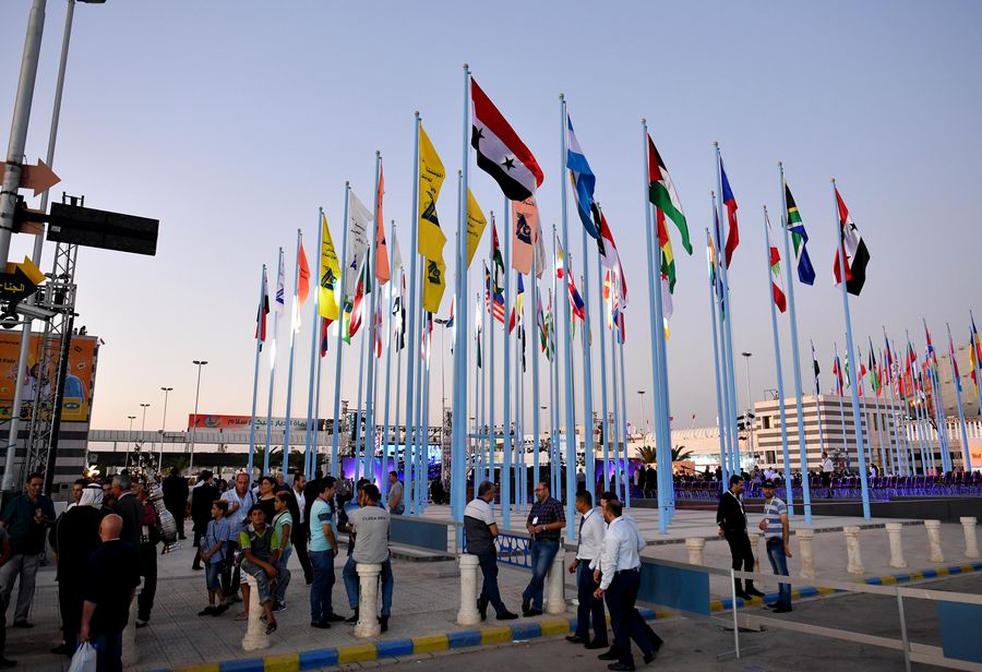 Flags of foreign and Arab countries are seen at the entrance of the Damascus International Fair held in the Fairgrounds of the Syrian capital Damascus on Aug. 28, 2019. (Xinhua/Ammar Safarjalani)