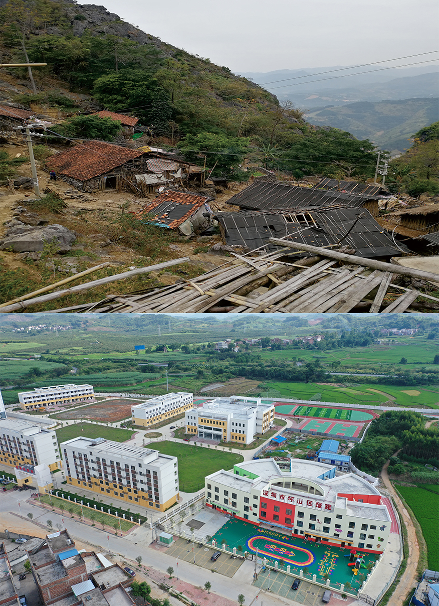Combo photo shows houses at Longbang Village, Nov. 21, 2018 (top, file photo) and a view of the resettlement site for poverty relief relocation for Longbang Village in Silin Township in Tiandong County, south China's Guangxi Zhuang Autonomous Region, Aug. 28, 2019 (bottom, aerial photo taken by Cao Yiming). (Xinhua)