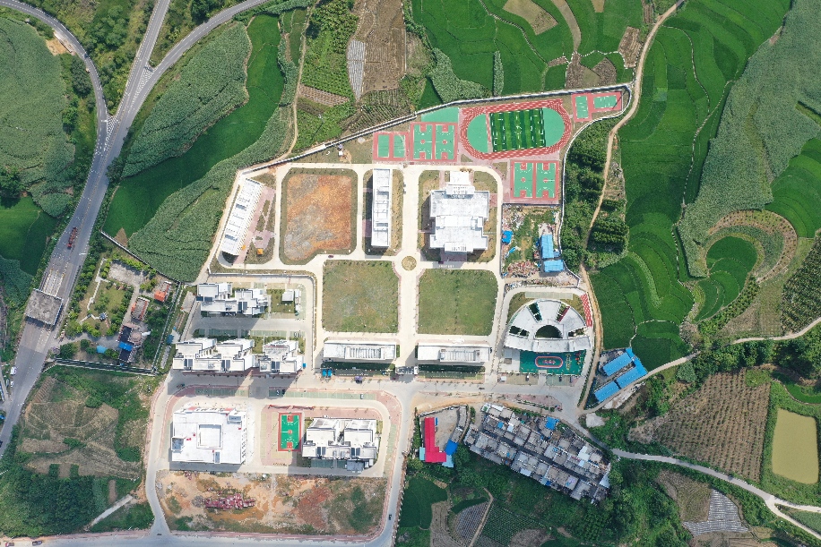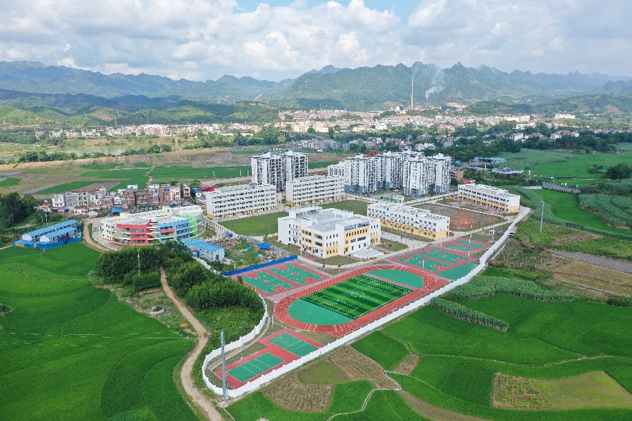Aerial photo taken on Aug. 28, 2019 shows the resettlement site for poverty relief relocation for Longbang Village at Silin Township in Tiandong County, south China's Guangxi Zhuang Autonomous Region. (Xinhua/Cao Yiming)