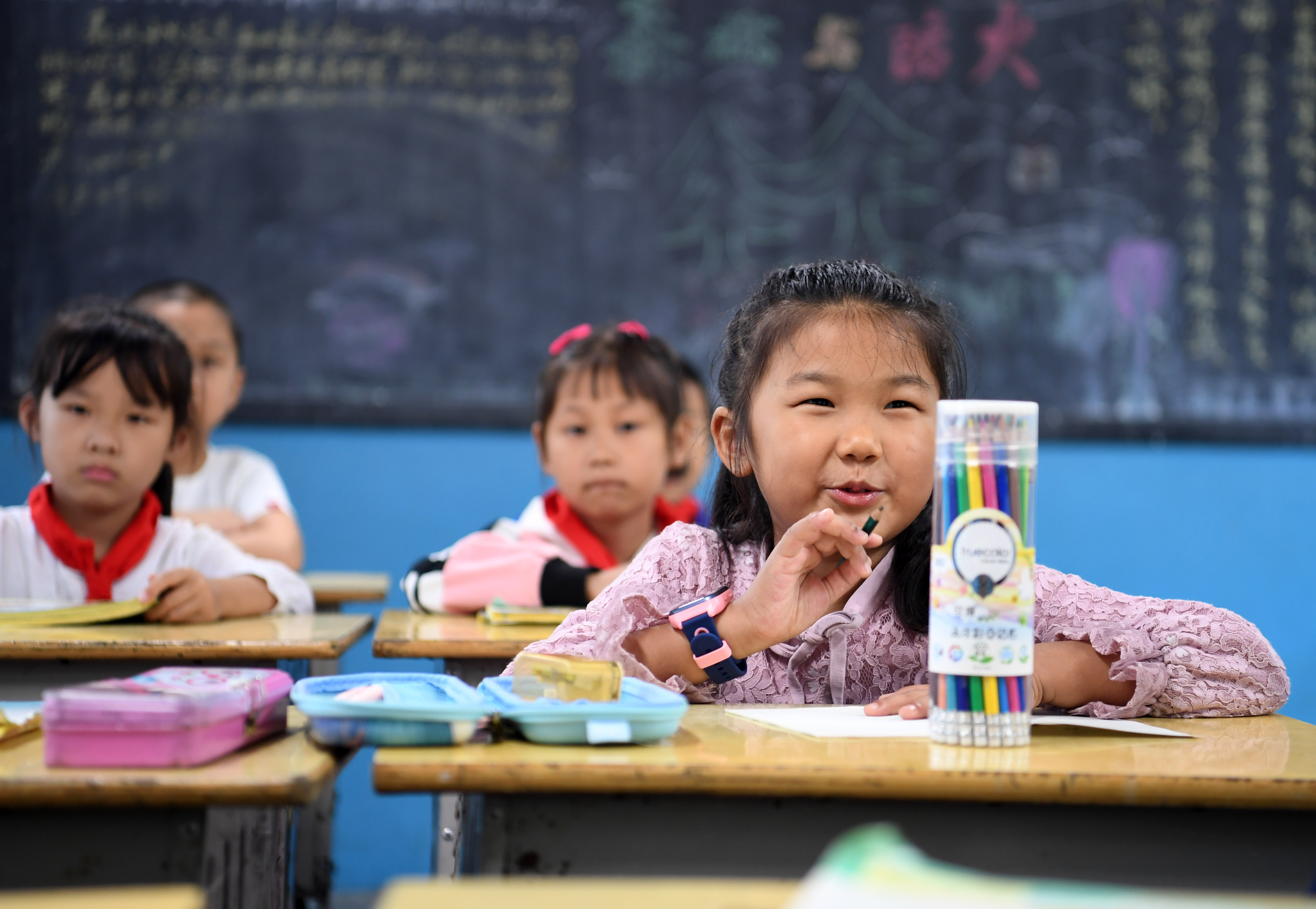 Zhang Qingyu (R) has her first lesson at the central primary school of Huangjian in Qingxi Village, Huangjian Township of east China's Anhui Province, Sept. 1, 2019.(Xinhua/Zhang Duan)