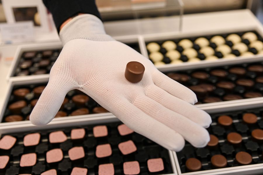 Chocolate candies are seen in a shop in Brussels. Belgium has a great history of making chocolate, which is an important export product of the country. (Xinhua/Zheng Huansong)