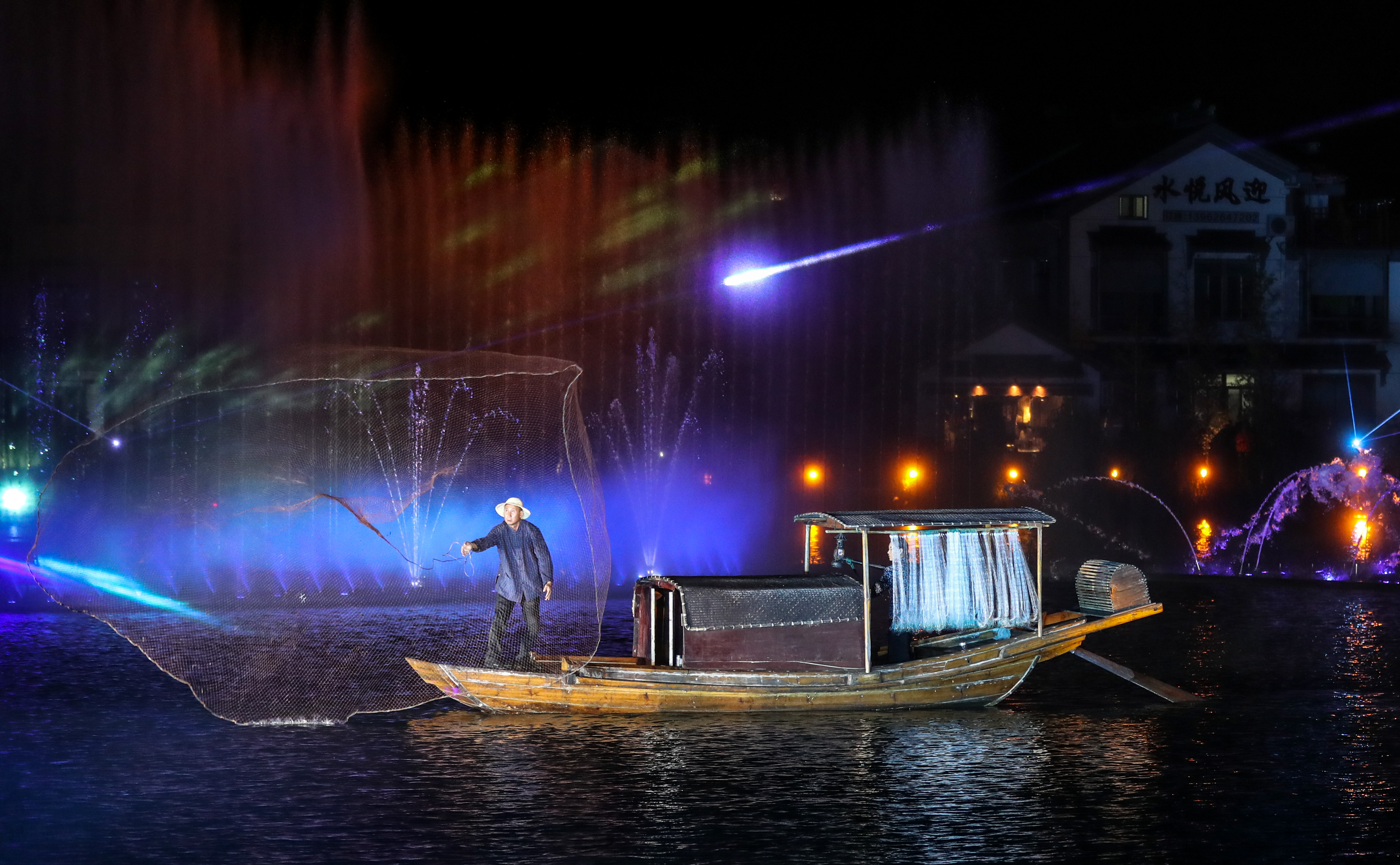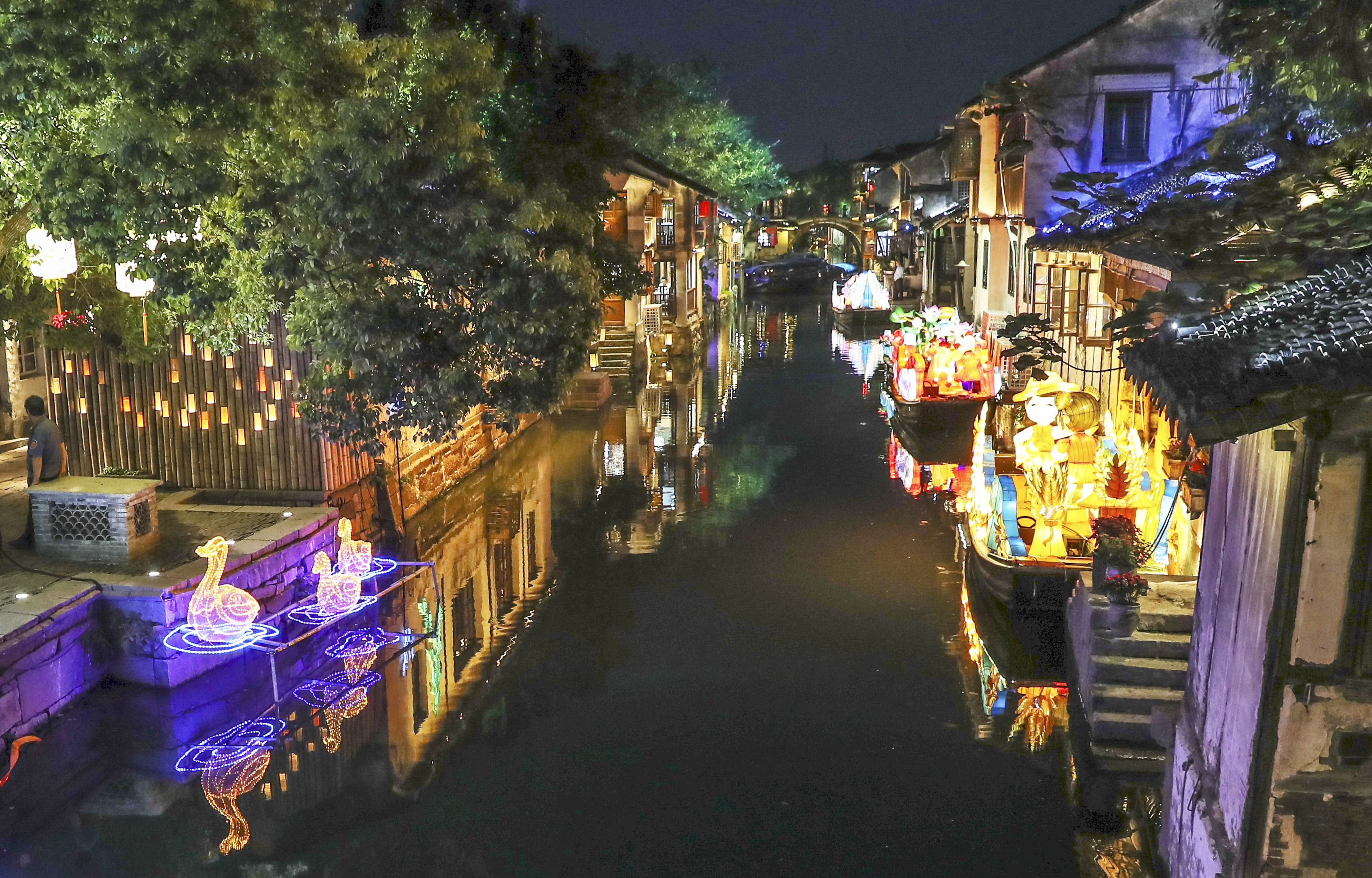 An actor performs on a vessel during a lighting ceremony of a lantern fair in Zhouzhuang Township of Kunshan City in east China's Jiangsu Province, Sept. 12, 2019. (Xinhua/Yang Lei)