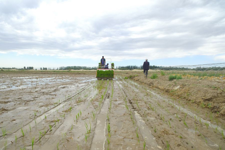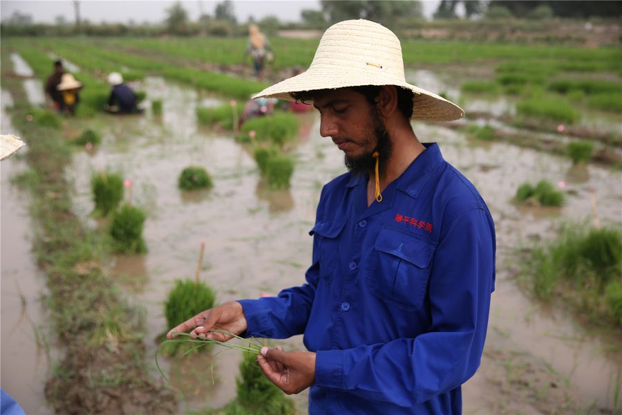 The saline soil rice R&D team of Yuan Longping work in a test field in Baiyiawati of Yopurga County, northwest China's Xinjiang Uygur Autonomous Region, June 3, 2019. The saline soil rice R&D team of Yuan Longping, the prestigious pioneer of hybrid rice, is expanding its planting scale on the western margin of the Taklimakan desert in Xinjiang Uygur Autonomous Region. (Xinhua/Ren Liying)