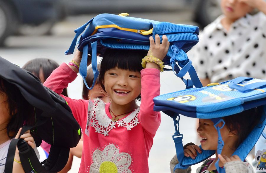 Children receive schoolbags as gifts for their summer vacation from volunteers at Wuying, a village of Miao ethnic group under joint administration by Rongshui County in Guangxi Zhuang Autonomous Region and its neighbouring Congjiang County of Guizhou Province, July 27, 2019. (Xinhua/Huang Xiaobang)