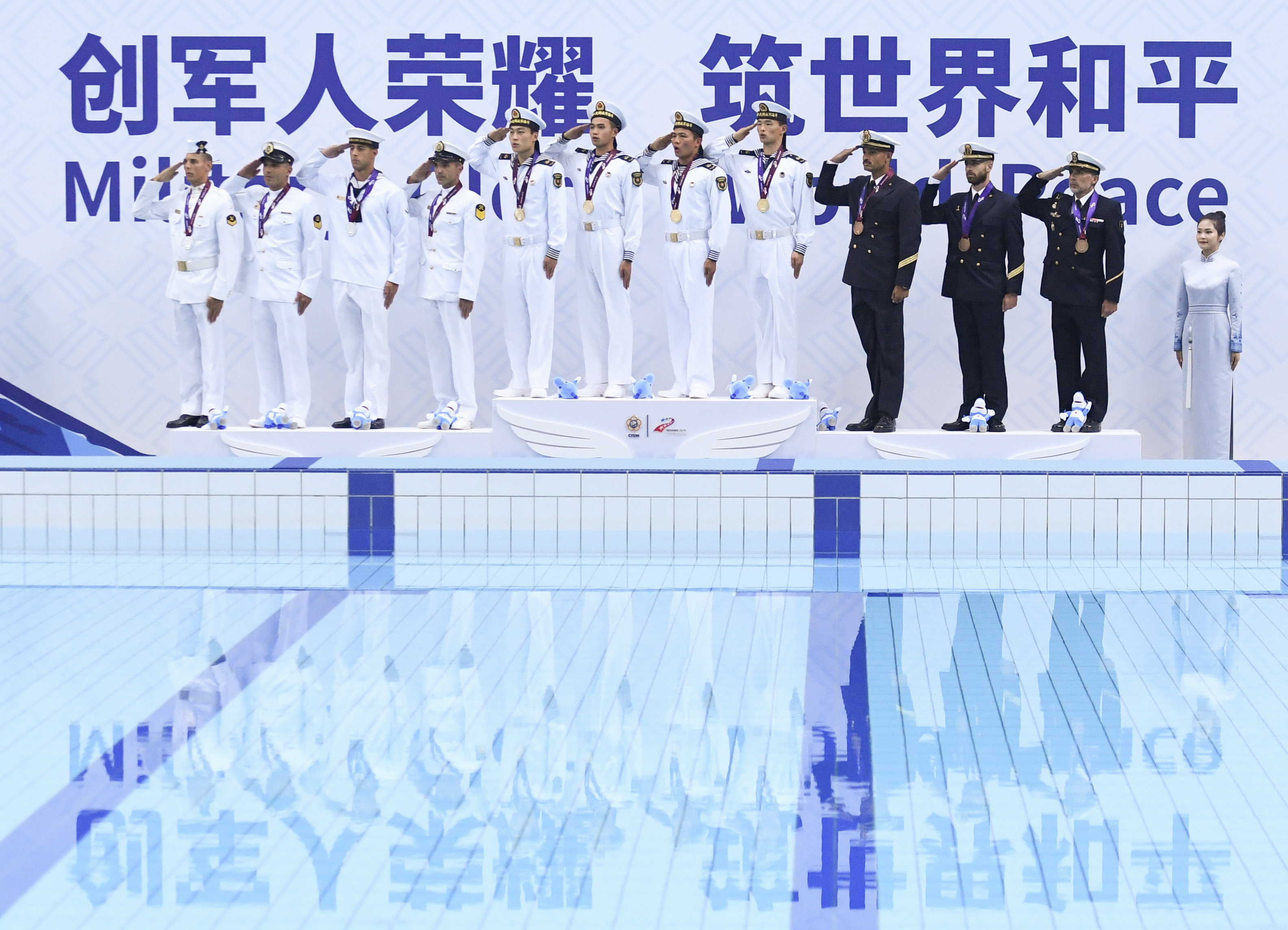 Gold medalists team China (C), silver medalists team Brazil (L) and bronze medalists team Spain attend the awarding ceremony of the men's obstacle relay of naval pentathlon at the 7th CISM Military World Games in Wuhan, capital of central China's Hubei Province, Oct. 26, 2019. (Xinhua/Chen Yehua)