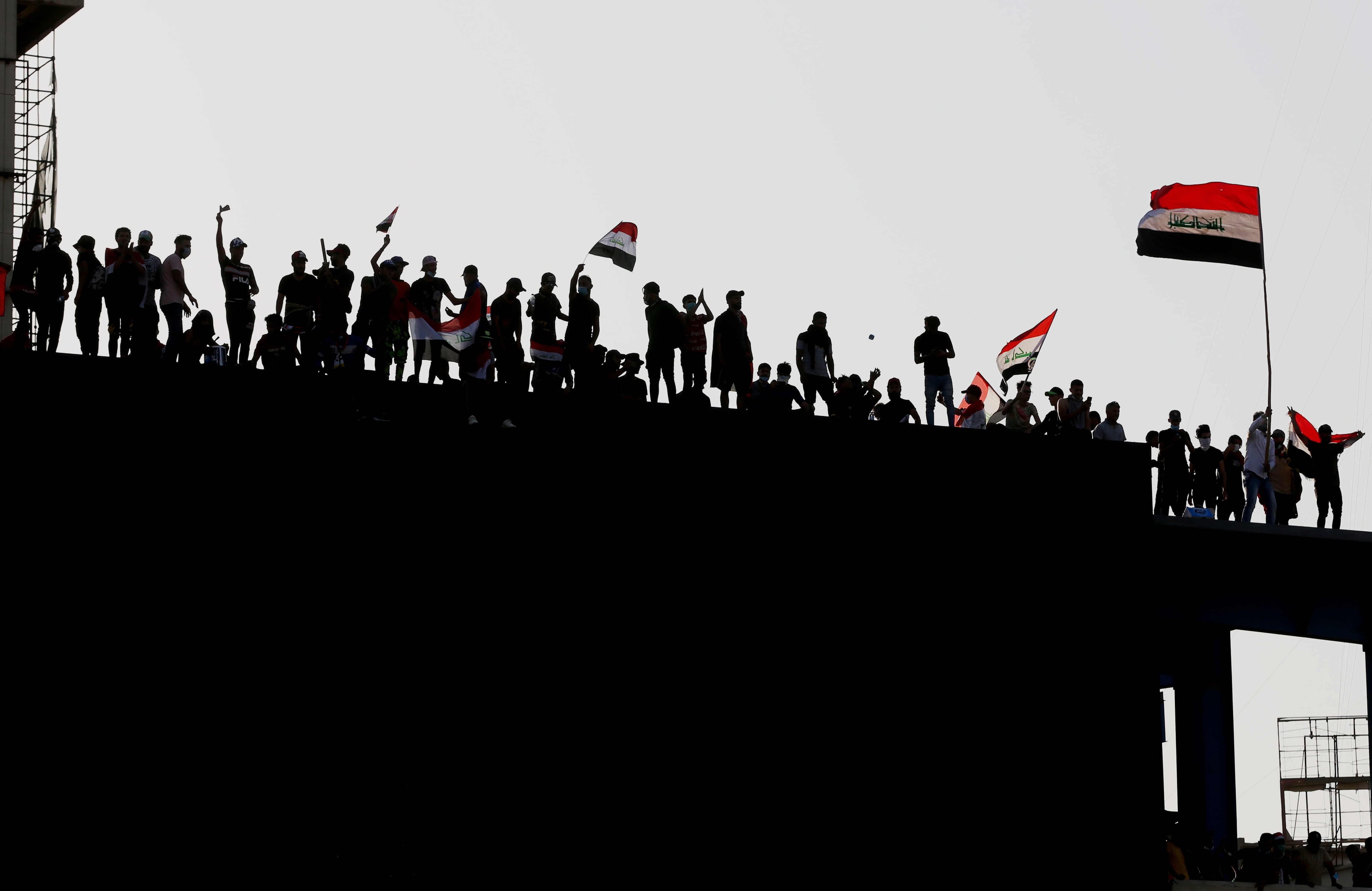 Protesters wave flags on the rooftop of a building during a protest at Tahrir Square in Baghdad, Iraq, on Oct. 26, 2019. (Xinhua/Khalil Dawood)