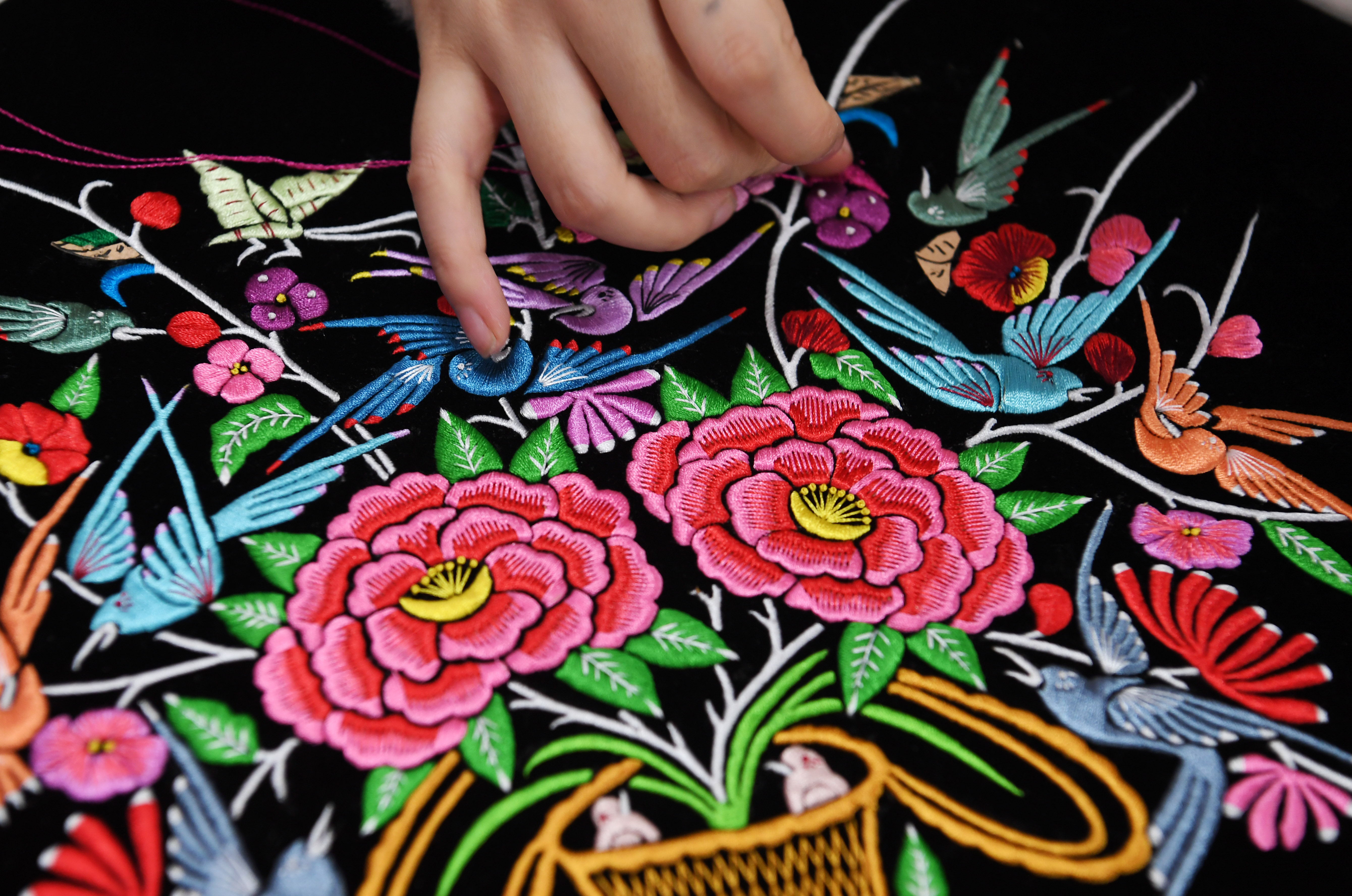 A participant makes a piece of embroidery in a skillful craftsman contest during the 2019 China (Guizhou) International Folk Crafts and Cultural Products Expo in Guiyang, southwest China's Guizhou Province, Oct. 25, 2019. (Xinhua/Yang Wenbin)
