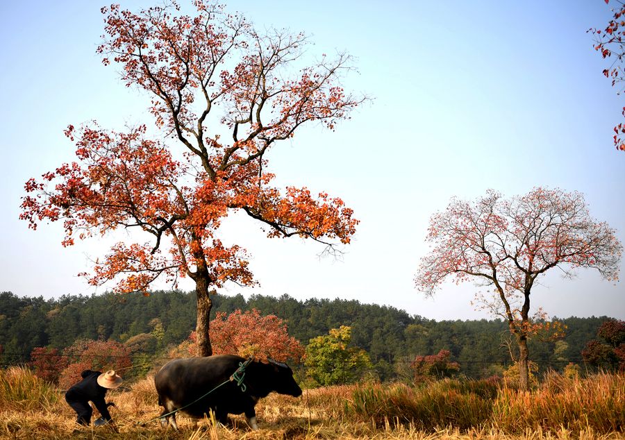 A farmer ploughs in the field with an ox at the foot of Dabieshan Mountain, Nov. 3, 2019. (Photo by Hao Yuan/Xinhua)