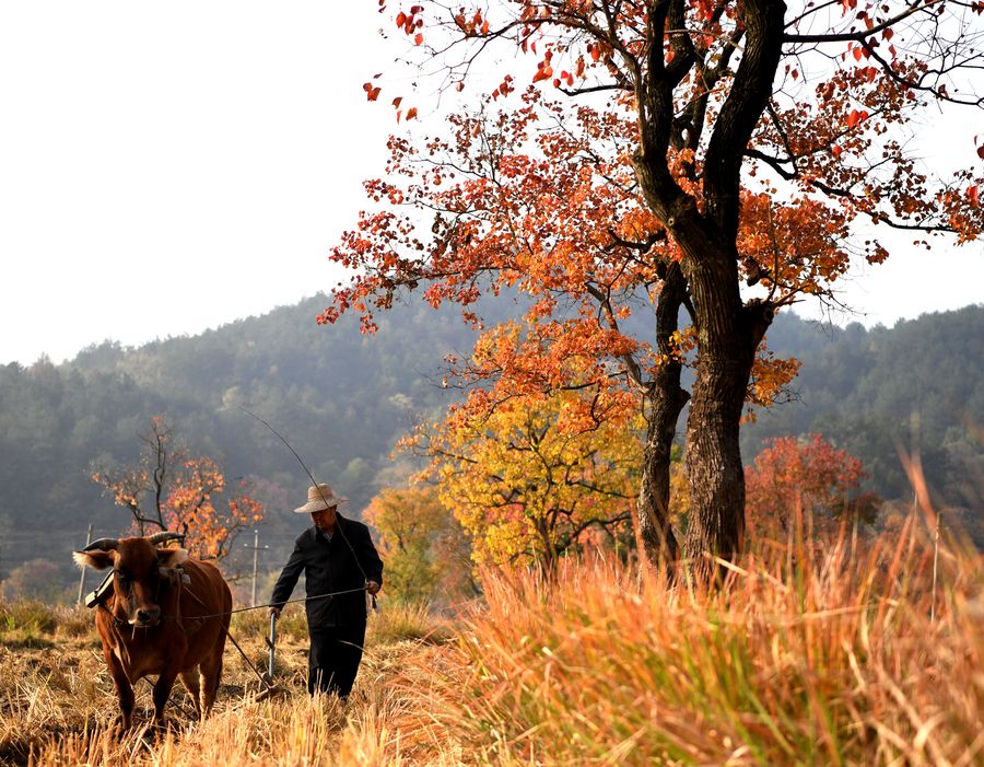 A farmer ploughs in the field with an ox at the foot of Dabieshan Mountain in Liluocheng Village of Xinyang City, central China's Henan Province, Nov. 3, 2019. (Photo by Hao Yuan/Xinhua)