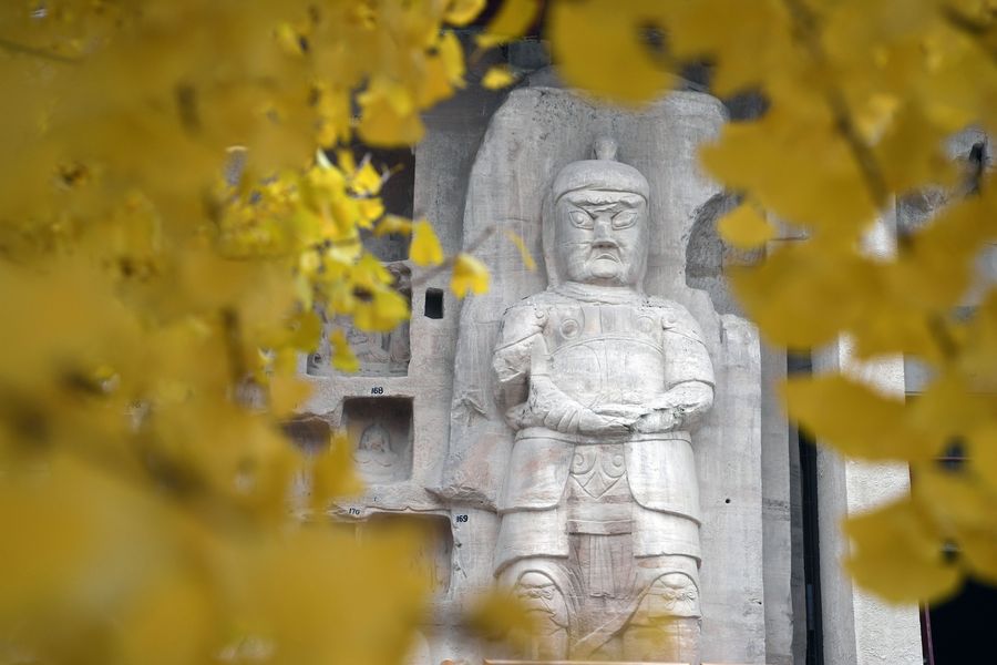 A tourist walks past a stone statue at the North Grotto Temple in Qingyang, northwest China's Gansu Province, Nov. 5, 2019. (Xinhua/Ma Ning)