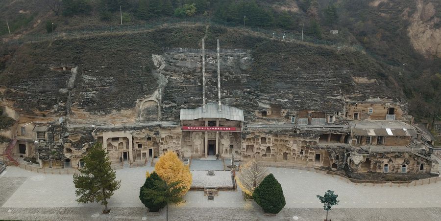 Aerial photo taken on Nov. 5, 2019 shows the North Grotto Temple in Qingyang, northwest China's Gansu Province. (Xinhua/Ma Ning)