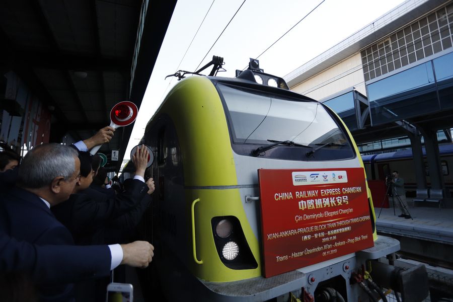 People welcome the first China Railway Express freight train at the Ankara train station in Ankara, Turkey, Nov. 6, 2019. (Photo by Mustafa Kaya/Xinhua)
