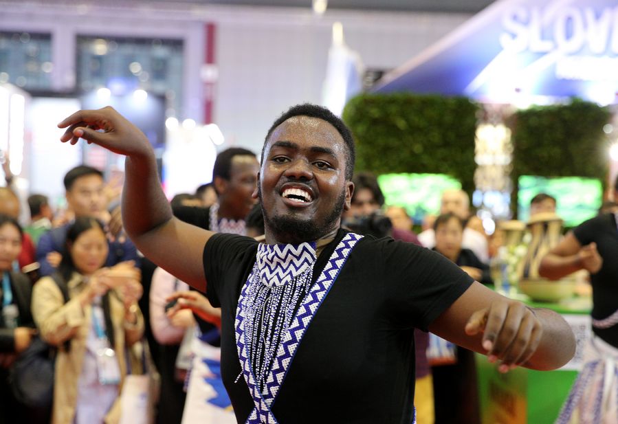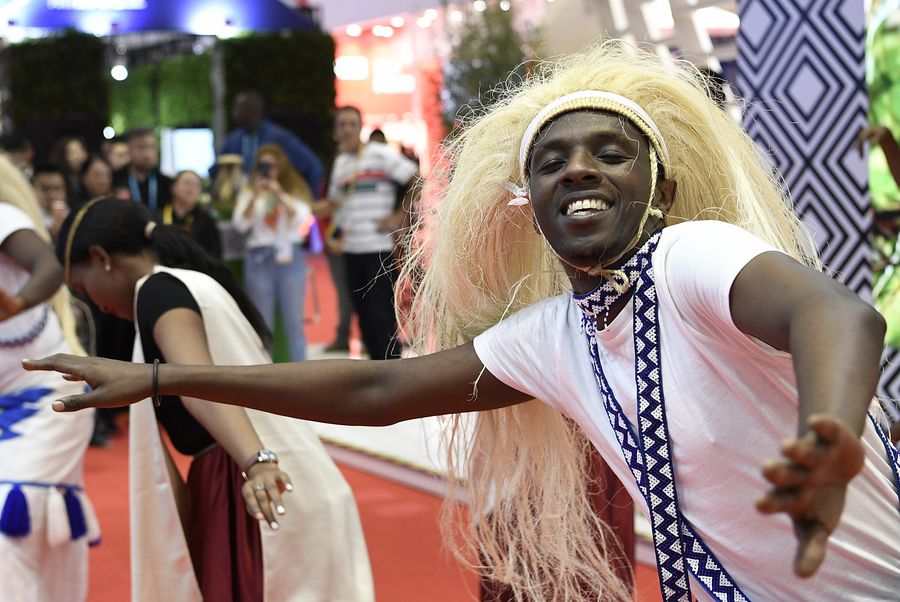 A performer dances at the Rwanda pavilion during the second China International Import Expo (CIIE) in Shanghai, east China, Nov. 6, 2019. (Xinhua/Zhang Chuanqi)