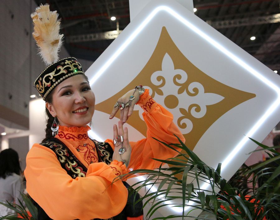 A staff member poses for photos at the Kazakhstan pavilion during the second China International Import Expo (CIIE) in Shanghai, east China, Nov. 6, 2019. (Xinhua/Zhang Chuanqi)