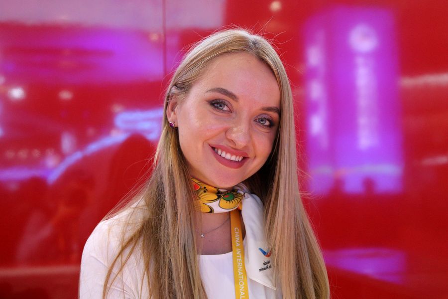 A staff member poses for photos at the Russia pavilion during the second China International Import Expo (CIIE) in Shanghai, east China, Nov. 6, 2019. (Xinhua/Zhang Chuanqi)