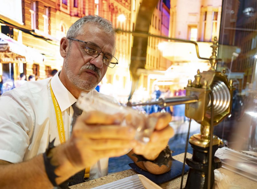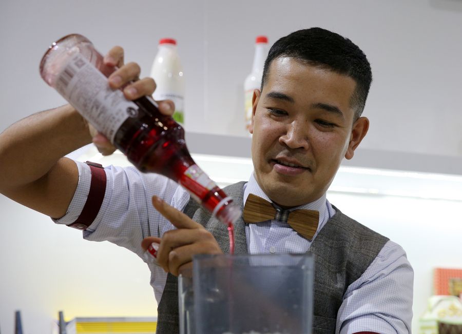 A mixologist works at the Kazakhstan pavilion during the second China International Import Expo (CIIE) in Shanghai, east China, Nov. 6, 2019. (Xinhua/Zhang Chuanqi)