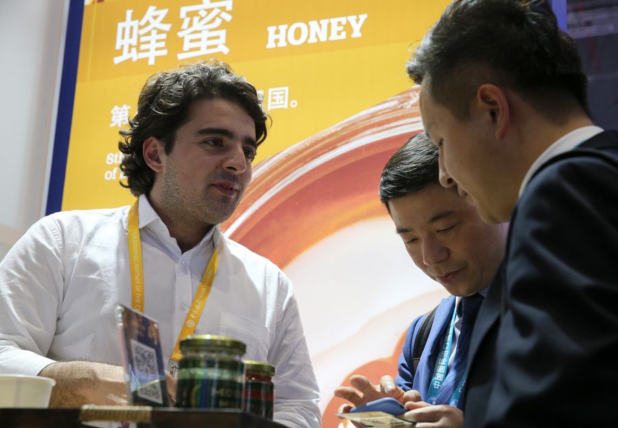 A Brazilian exhibitor (L) talks with visitors during the second China International Import Expo (CIIE) in Shanghai, east China, Nov. 6, 2019. (Xinhua/Zhang Chuanqi)