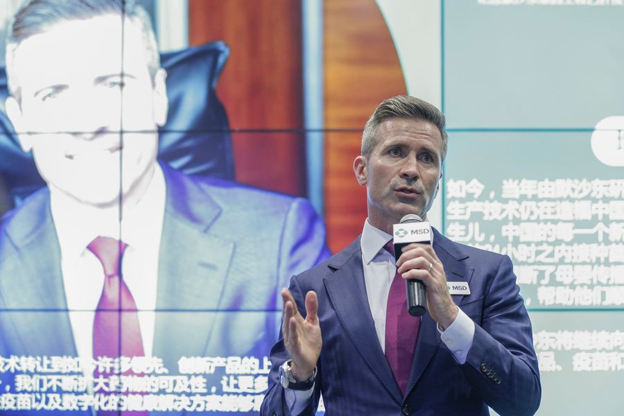 Joseph Romanelli, senior vice president of MSD and president of MSD China, speaks at the company booth during the second China International Import Expo (CIIE) in Shanghai, east China, Nov. 7, 2019. (Xinhua/Zhang Yuwei)