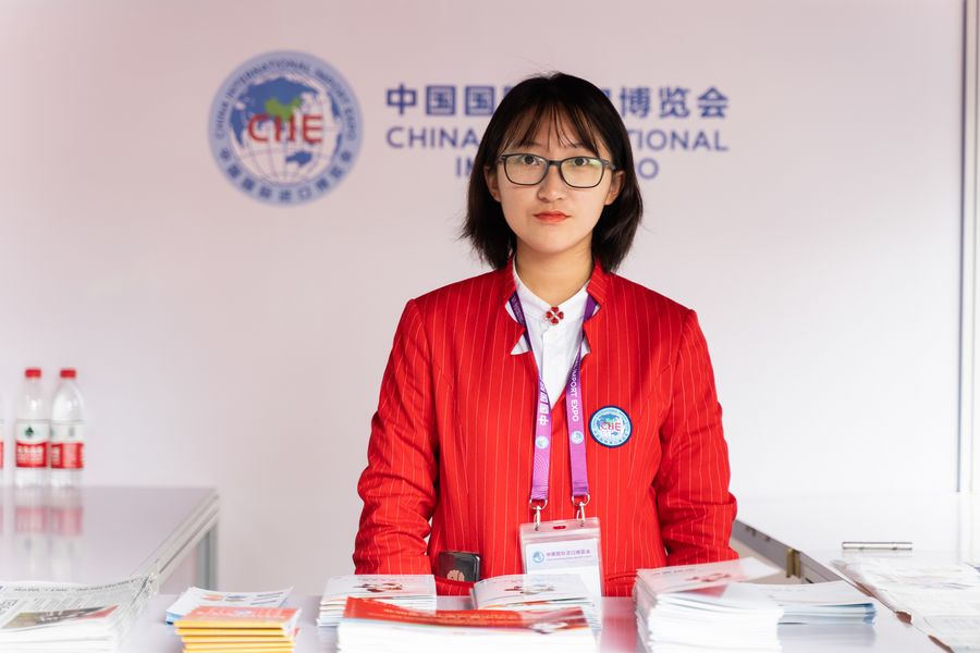 A volunteer poses for a photo during the second China International Import Expo (CIIE) in Shanghai, east China, Nov. 7, 2019. (Xinhua/Zhang Xiaoyu)