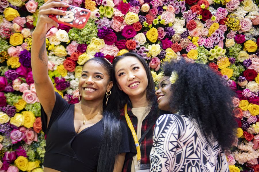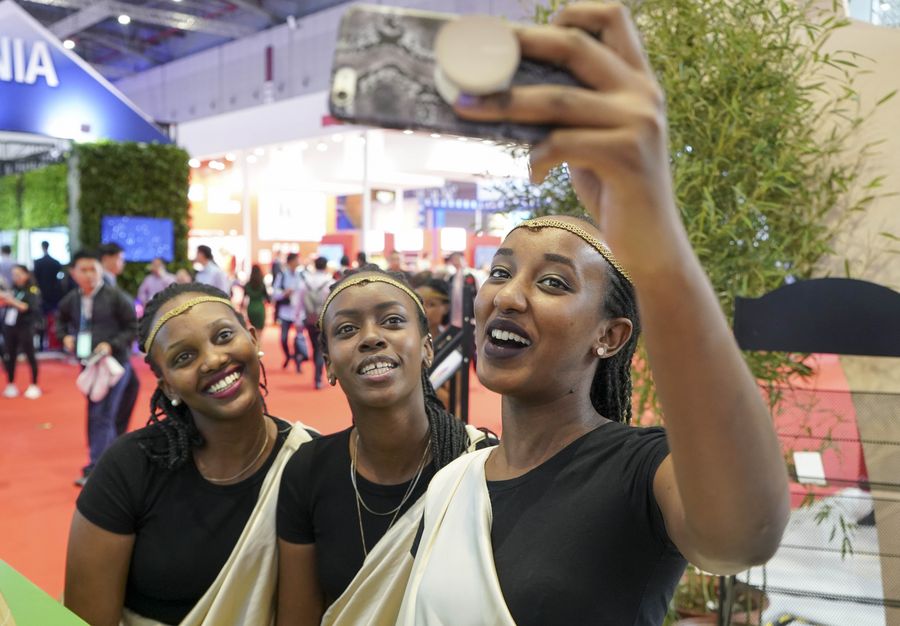 Staff members take selfies at the Rwanda pavilion during the second China International Import Expo (CIIE) in Shanghai, east China, Nov. 7, 2019. (Xinhua/Yin Gang)