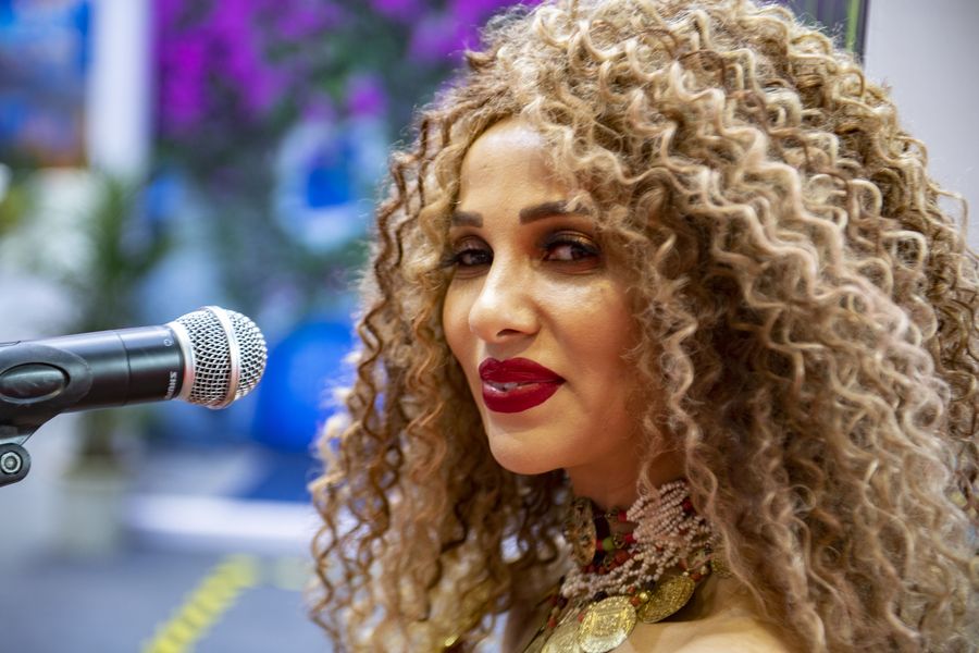 Singer Lamia Ktata performs at the Tunisia pavilion during the second China International Import Expo (CIIE) in Shanghai, east China, Nov. 7, 2019. (Xinhua/Purbu Zhaxi)