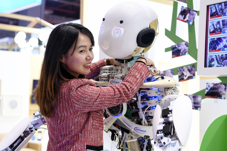 A visitor poses for a photo with Roboy, a humanoid robot of Infineon, at the Sci-tech Life exhibition area during the second China International Import Expo (CIIE) in Shanghai, east China, Nov. 7, 2019. (Xinhua/Fan Peishen)